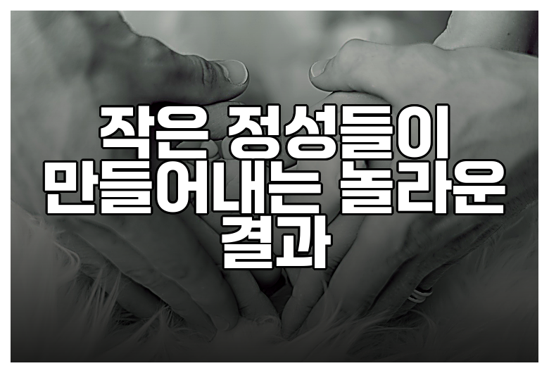 작은 정성들의 집합적인 힘은 상상 이상입니다. 단 하나의 작은 행동이라도, 그 행동이 다른 사람에게 긍정적인 영향을 미칠 수 있다는 점을 기억하세요. 수많은 작은 정성들이 모여 커다란 변화를 만들어낼 수 있다는 것을 잊지 마십시오.