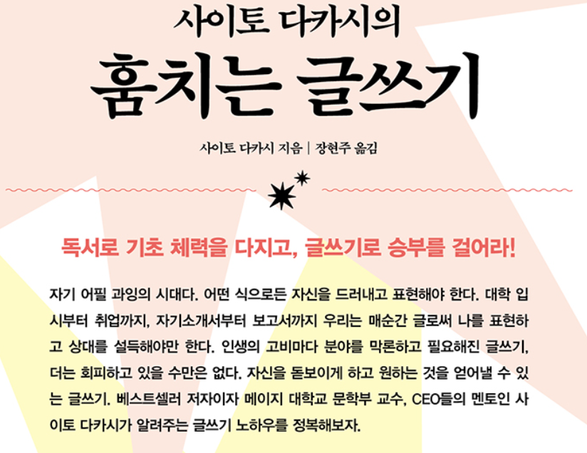 책의 줄거리는 글쓰기를 효과적으로 수행하기 위한 다양한 원칙과 전략을 다룹니다. 사이토 다카시는 글쓰기를 '훔치는' 방식으로 접근하여, 성공적인 글쓰기의 비밀을 파헤칩니다. 그는 다양한 글쓰기 기법과 전략을 소개하며, 이를 통해 독자들이 자신의 글쓰기 능력을 향상시킬 수 있도록 돕습니다. 기술적 접근: 다카시는 글쓰기의 기본 기술부터 시작하여, 문장 구조, 문법, 표현 방법 등을 자세히 설명합니다. 이러한 기술적 접근은 글쓰기를 처음 접하는 사람들에게도 유용하며, 기본기를 다지는 데 도움이 됩니다. 창의적 접근: 기술적 접근을 넘어, 다카시는 창의적인 글쓰기에 대한 접근법을 제시합니다. 그는 독창적인 아이디어를 발굴하고, 이를 효과적으로 표현하는 방법에 대해 설명합니다. 이 부분에서는 독자들이 자신의 독창성을 발휘할 수 있는 다양한 기법들을 배울 수 있습니다. 전략적 접근: 글쓰기에서 중요한 것은 단순히 글을 잘 쓰는 것이 아니라, 독자의 관심을 끌고 메시지를 효과적으로 전달하는 것입니다. 다카시는 글쓰기 전략에 대해서도 다루며, 독자들이 자신의 글을 어떻게 구성하고, 어떤 전략을 사용할지를 제시합니다.