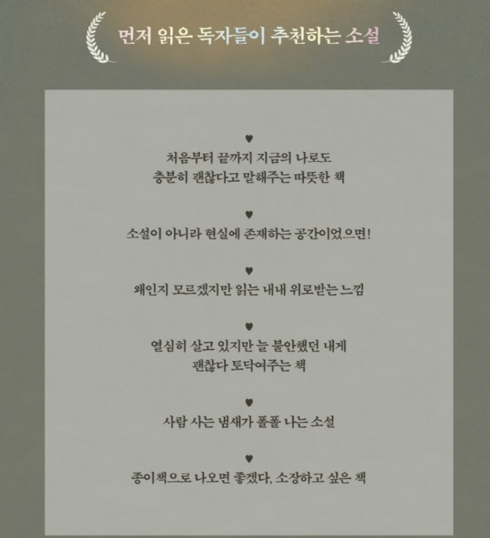 이 책은 크고 작은 상처와 희망을 가진 사람들이 휴남동 서점이라는 공간을 안식처로 삼아 함께 살아가는 모습을 그린 소설이다. 서점 대표 영주와 바리스타 민준, 단골손님 정서, 블로거이자 작가 승우, 로스팅 업체 대표 지미, 그리고 사는 게 재미없는 고등학생 민철이 낭만적인 공간에서 관계를 맺으며 각자 처한 상황을 나름의 방식으로 견뎌내는 모습이 빛난다.