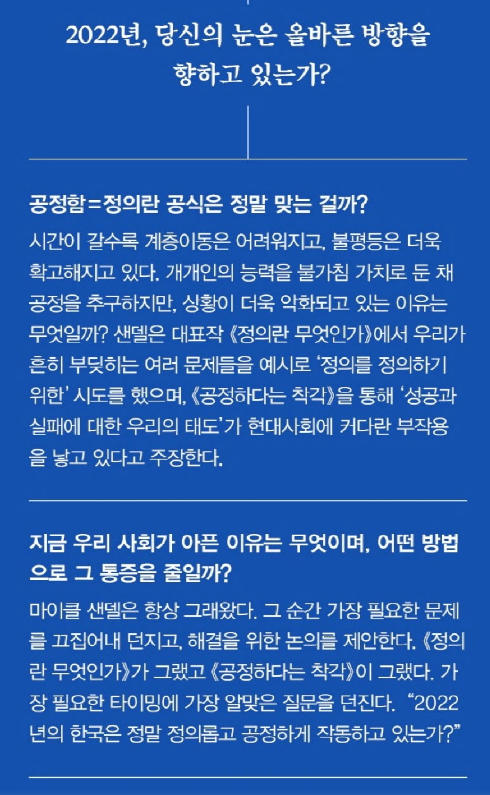 "정의란 무엇인가"는 정의에 대한 깊이 있는 성찰을 통해 더 나은 사회를 만들기 위한 의지를 갖게 해주는 책입니다. 3,000자 이상의 글에서 이 책의 매력을 완전히 담아내기는 어렵지만, 이 글이 독자들에게 "정의란 무엇인가"를 읽는 계기가 되기를 바랍니다.