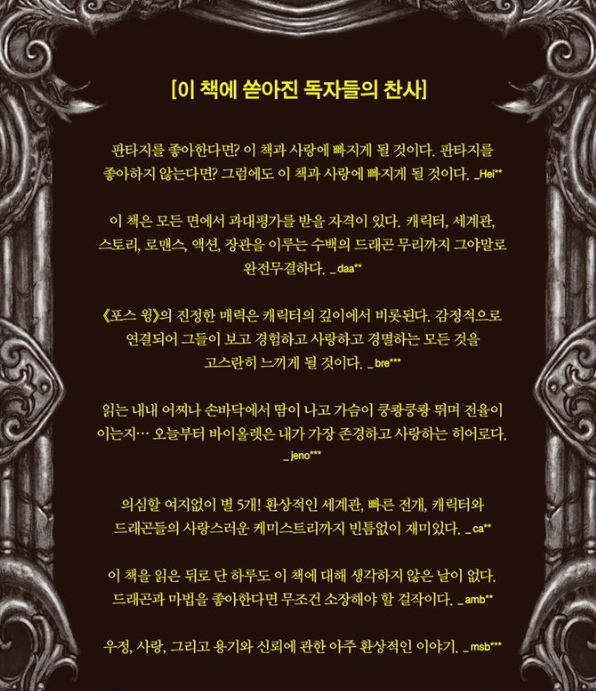 ‘포스 윙’을 읽으면서 가장 인상 깊었던 점은 인간의 도덕적 갈등을 진지하게 다룬 부분입니다. 전쟁과 권력이라는 극단적인 상황에서 인물들이 직면하는 선택과 그로 인한 결과는 독자들에게 큰 교훈을 줍니다. 또한, 미래 사회의 복잡성과 그로 인한 갈등은 현실 사회와의 유사성을 보여주며, 독자들에게 깊은 사고를 유도합니다. 전반적으로 ‘포스 윙’은 SF 소설의 전형적인 요소를 넘어서 인간 존재와 도덕적 선택에 대한 깊이 있는 질문을 던지는 작품입니다. 이 책을 통해 독자들은 단순한 오락을 넘어서, 진지한 성찰과 감동을 경험할 수 있을 것입니다.